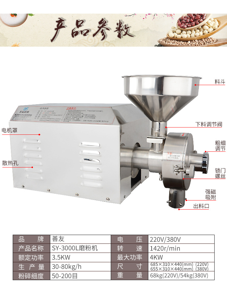 (2014年五谷杂粮磨粉机之冠)-善友首家研发改进,此款机子在原来3000型磨粉机上又改良了许多,满足了客户使用需求,成为大家所极为认可的五谷磨粉设备。
