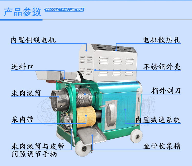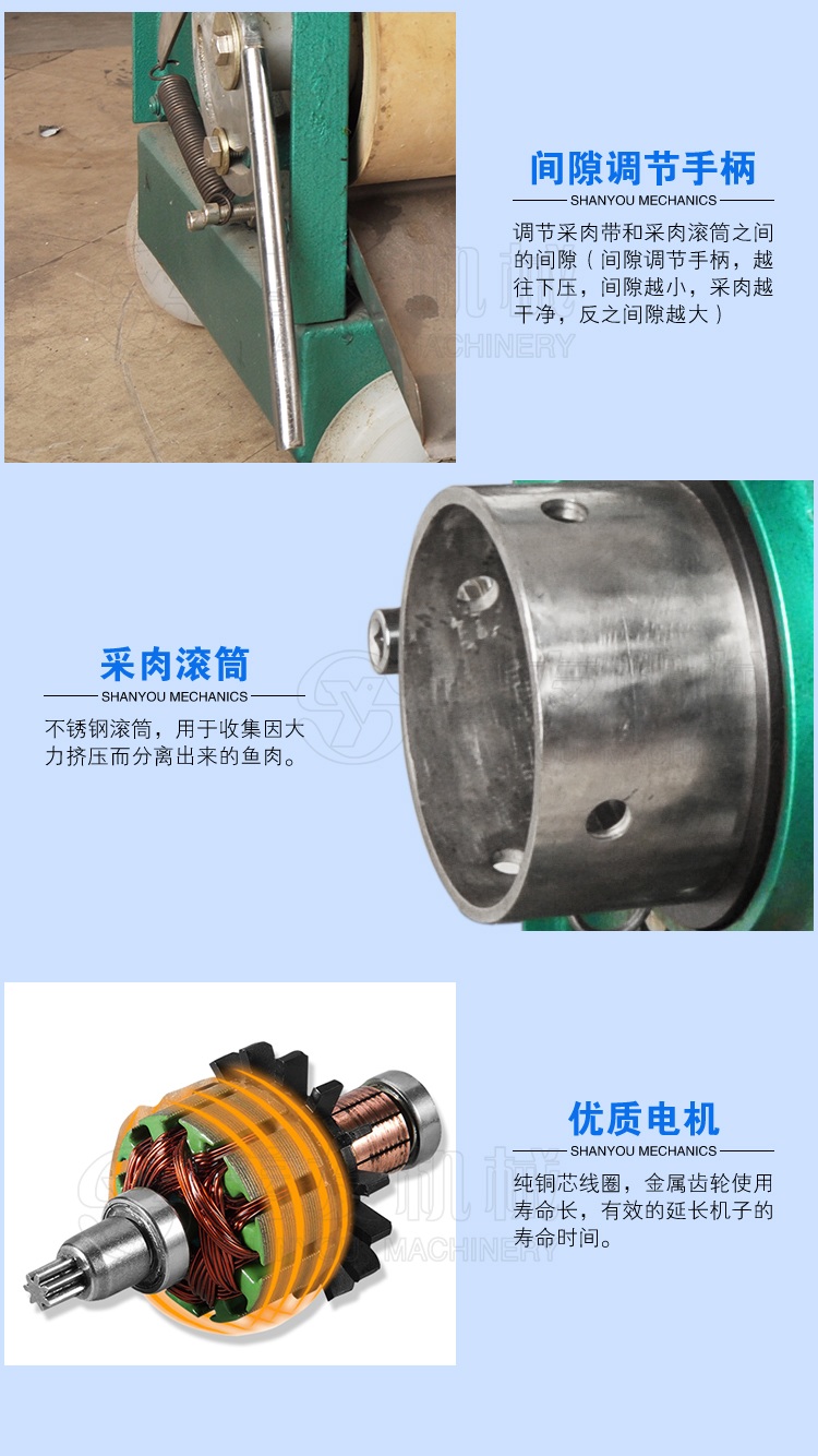 本机装有采肉桶和压榨肉用的橡胶带,利用滚动的采肉桶和传动的橡胶带的相互压榨运动将鱼挤入采肉桶内,而把鱼皮、鱼骨留在采肉桶外,由刮刀把它送出机外。