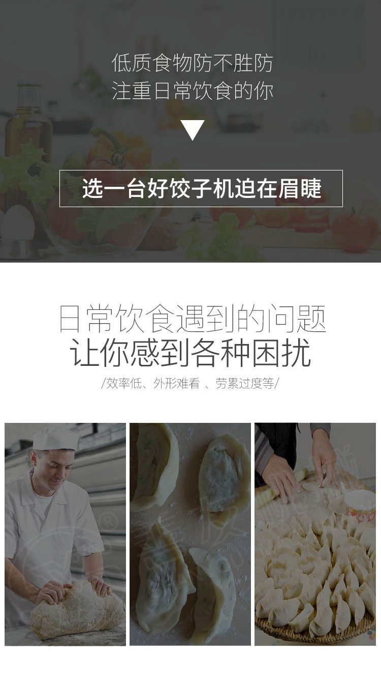 1. 一机多用途:只要更换模具,就可以制造不同的食品:春卷、馄饨、火锅水饺、珍珠水饺、咖喱饺子、花边饺子、锅帖饺子。